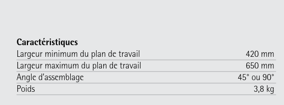 Cet appareil de conception robuste et précise, réalisé en résine phénolique de 12 mm d’épaisseur, permet l’usinage et l’assemblage des plans de travail, largeur 420 à maxi 650 mm, angles d’assemblage 45° ou 90° ainsi que l’usinage d’un rayon (arrondi extérieur).