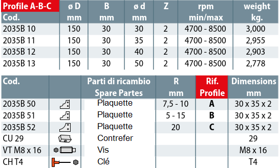 Corps de l’outil sans plaquettes, à la commande spécifier le type de profil A - B ou C