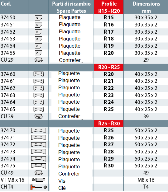 Plaquettes avec angles fuyants pour éviter le maraquage de la pièce.