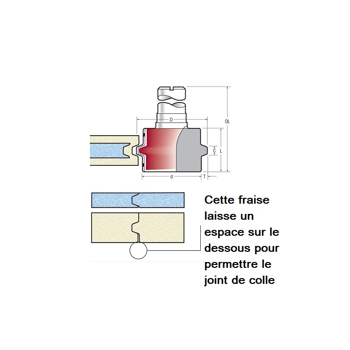 La fraise de rainurage laisse un espace sur la partie inférieure pour permettre le joint de colle.