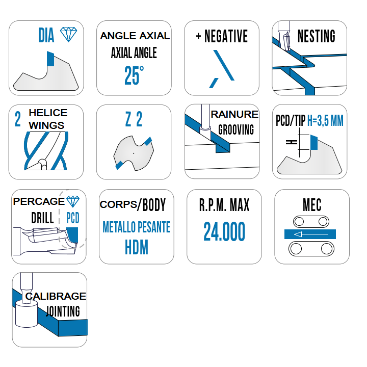 • Idéal pour l’usinage d’imbrication (NESTING), angle axial 25°, 2 hélices.
