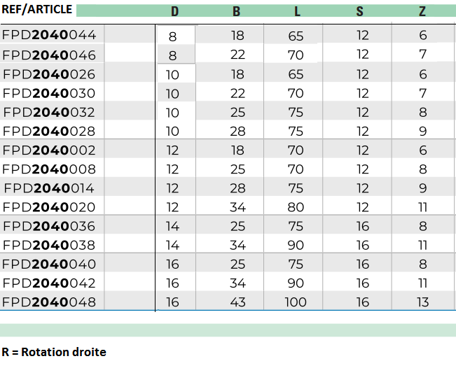 - Idéal pour l’usinage d’imbrication (NESTING), angle axial 25°, 2 hélices.