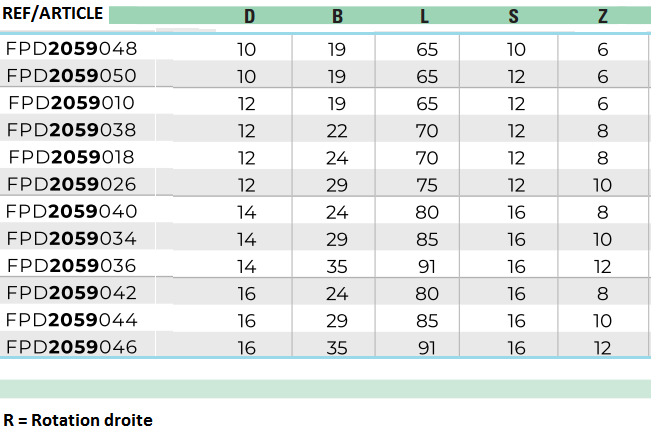 - Idéal pour l’usinage d’imbrication (NESTING), angle axial 25°, 4 hélices.