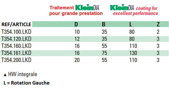 KleinDIA est un revêtement de surface antifriction DLC (Diamond Like Carbon) étudié pour les grandes productions qui permet de faire face aux problèmes liés à l'abrasion de l'outil, à l'évacuation des copeaux et aux agressions chimiques. Le revêtement KleinDIA offre un résultats excellents quand il est appliqué sur les fraises pour centres d'usinage.