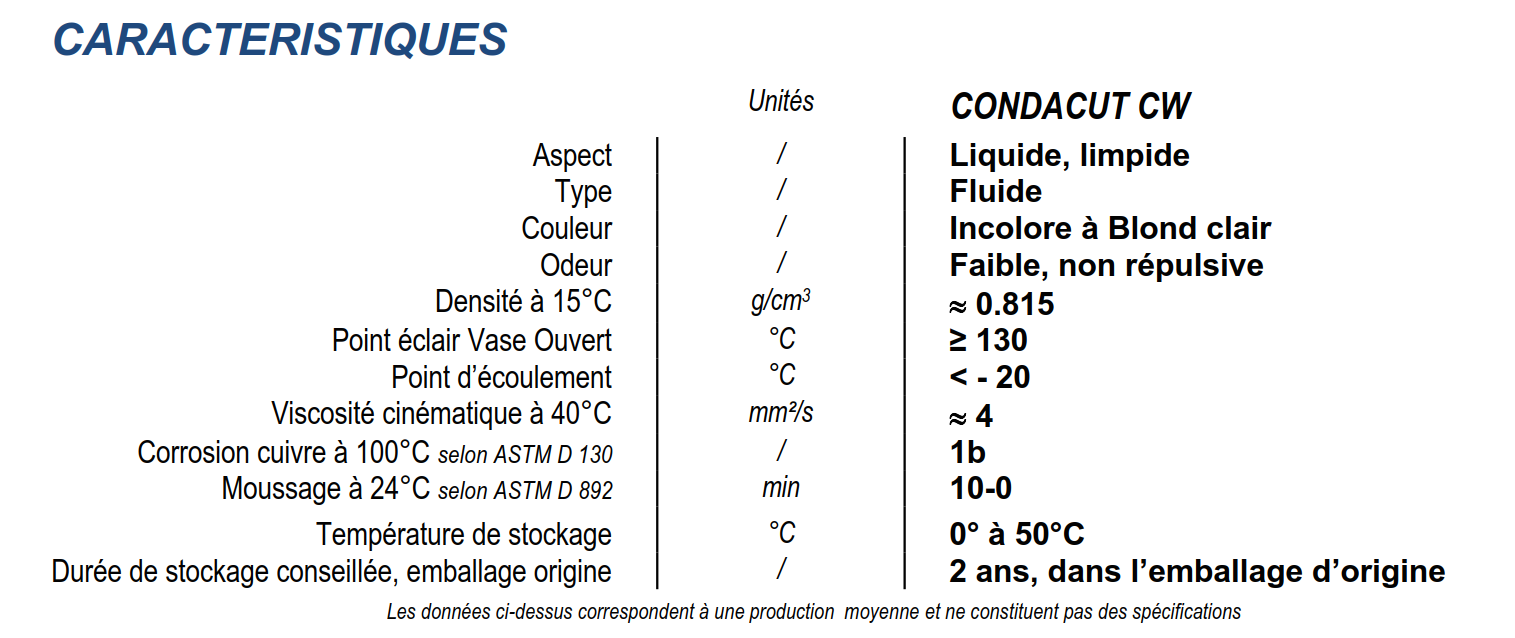CONDACUT CW est une huile entière très fluide, exempte de chlore, destinée aux opérations d’usinage par enlèvement de copeaux et abrasion, affutage et rectification en particulier.