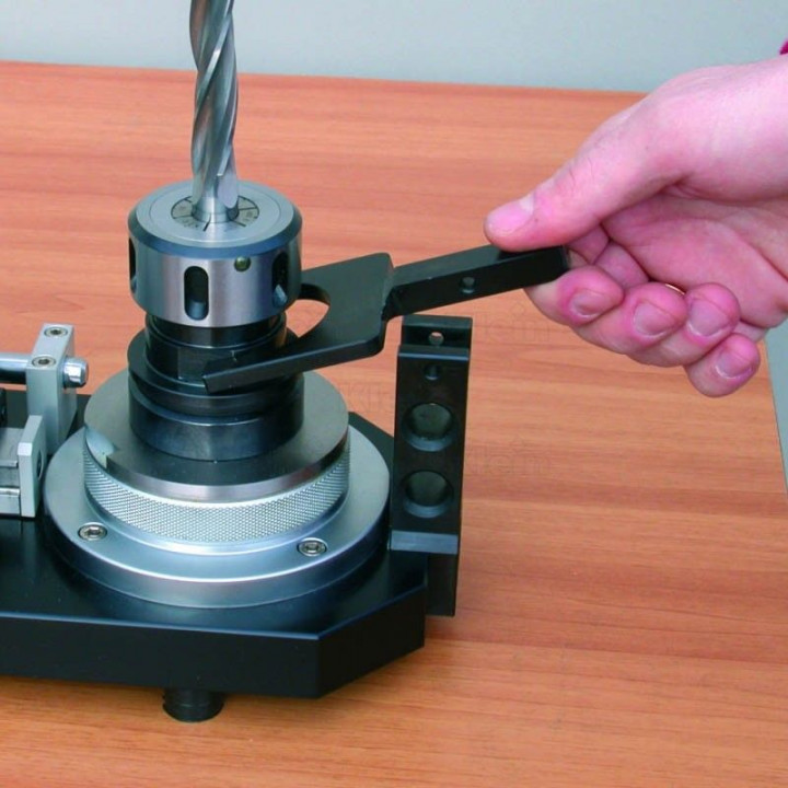 Accessoire spécial qui permet de bloquer le cône par l'intermédiaire d'une lumière étroite pour ajuster l'outil. Le blocage définitif de l'outil doit être fait au moyen d'un démonte cônes spéciale(voir notre. Art. T139). Une utilisation non conforme du Preset peut causer la perte de la précision centesimale de l'instrument