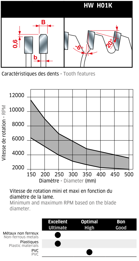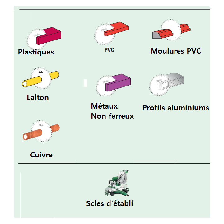 • Pour Scies à onglets avec fixation manuelle ou mécanique de la pièce à couper.