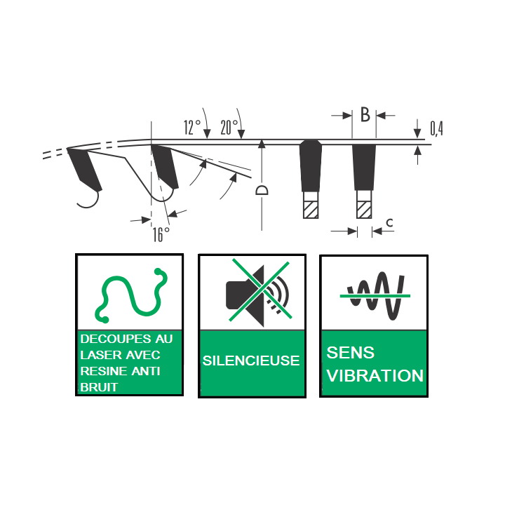 - Silencieuses, antibruit avec une résine spéciale insérée dans les découpes de la lame.