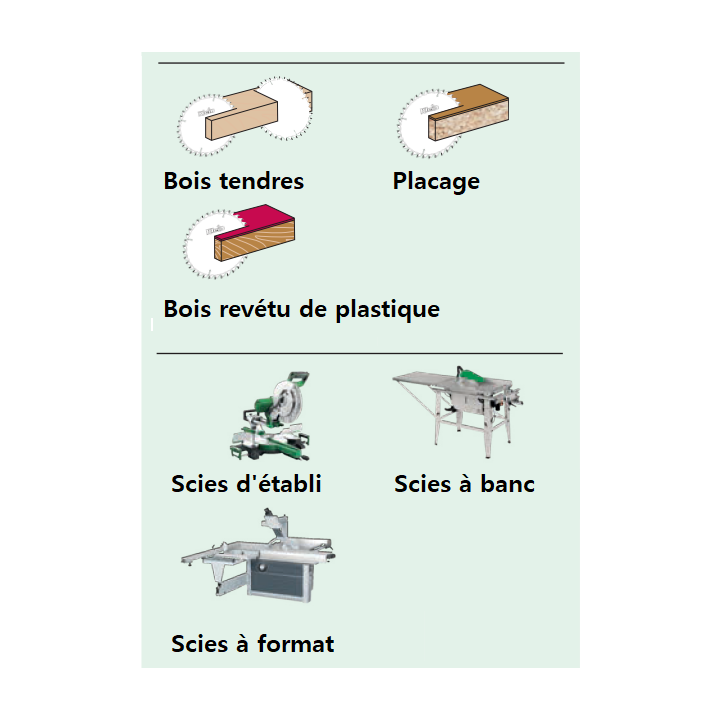 - Pour la coupe de long et travers des bois précieux, tendres et des panneaux stratifiés.