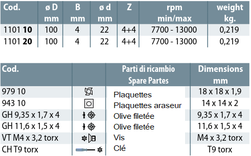 1101 20 lame alésage 22 avec 4 perçages fraisés pour montage sur Zeta, Top 20, Top 21, Classic systems.