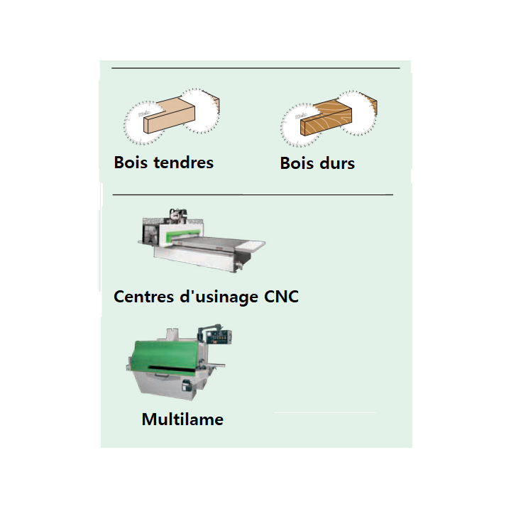- À utiliser sur les centres d'usinage CNC, les équipements multi-lames et les scieries.