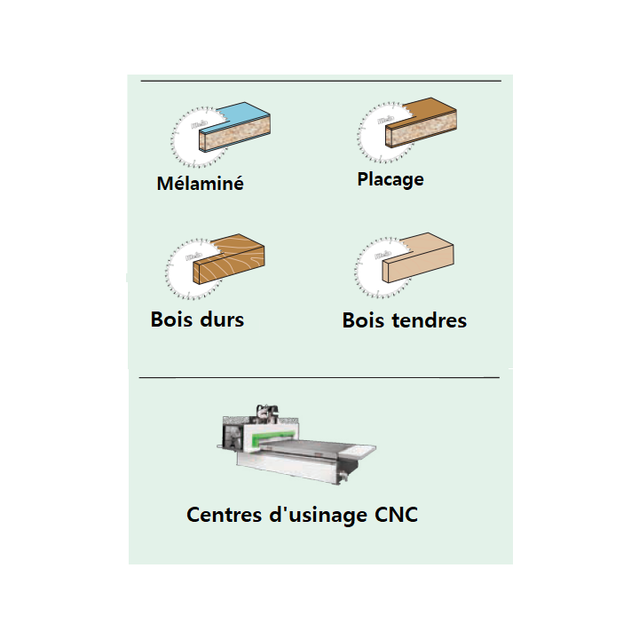 - Pour la coupe de long et travers des bois tendres, durs et exotiques, des panneaux agglomérés et nid d'abeille, des panneaux plaqués et stratifiés sur un côté.