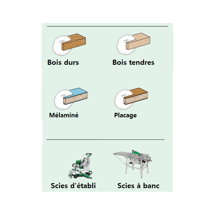 - S'utilisent sur scies à formats et scies radiales.