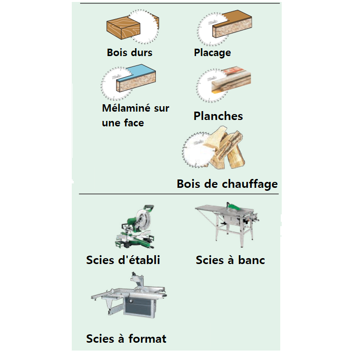 - Pour la coupe de long et travers des bois tendres, durs, exotiques, panneaux agglomérés et nid d'abeille, panneaux plaqués ou stratifiés d'un seul coté.