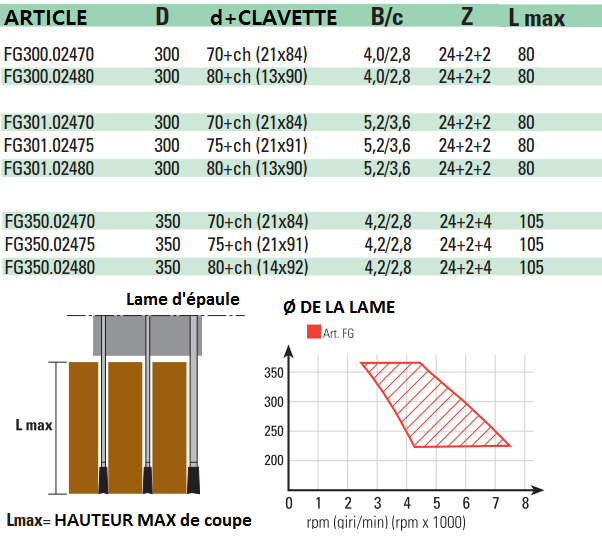 Caractéristiques de la lame de scie circulaire type FG- HW pour épaule de scies multilames: