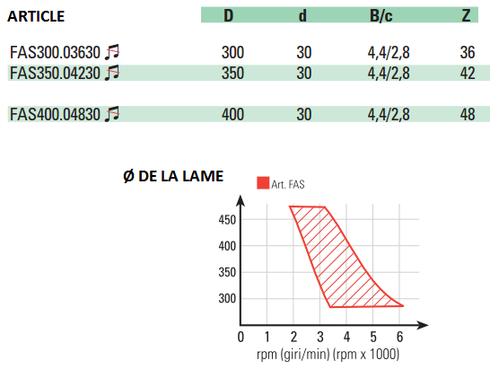 Caractéristiques de la lame de scie circulaire type FAS-HW pour scie circulaire radiale ou pendulaire: