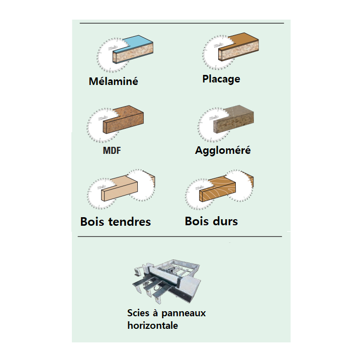 - Pour la coupe du long et travers des bois durs, tendres, exotiques, compensés, plaqués, mélaminés sur deux faces, MDF.