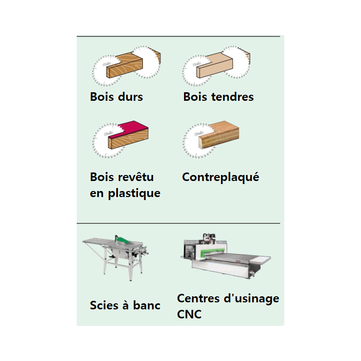 - Pour la coupe de long et travers des bois durs et tendres, exotiques et panneaux recouverts de plastique