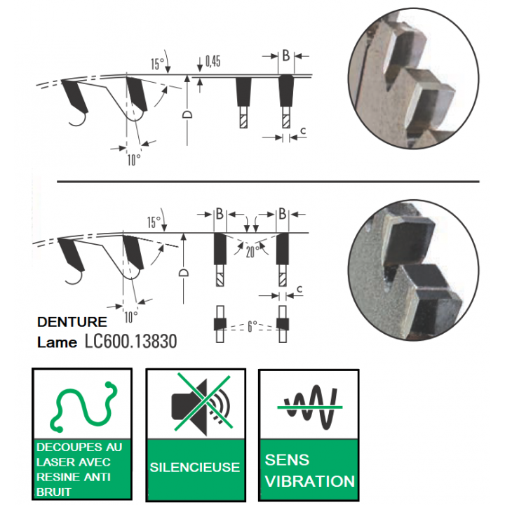 - Silencieuses et antibruit avec une résine spéciale insérée dans les coupes de la lame.