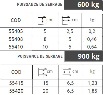 5 modèles disponibles voir caractéristiques techniques, dimensions, poids, puissance de serrage dans le tableau ci-dessus.