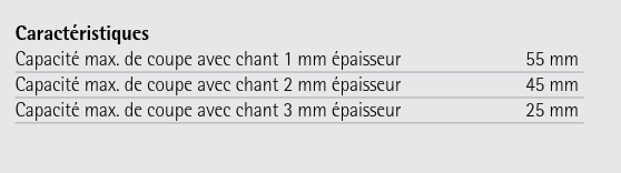 Bords courts jusqu'à 55 mm de large et 1 mm d'épaisseur, ou 25mm de large et 3 mm d'épaisseur.