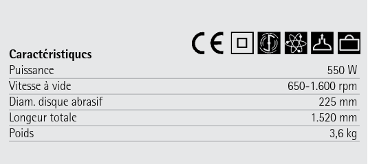 Idéal pour les peintres et plaquistes notre machine permet un travail rapide et sans fatigue. De conception robuste, son ergonomie liée à son faible poids ainsi que son équilibrage facilitent le ponçage des murs et plafonds sous des angles variés. L'emplacement du moteur à mi-distance de la tête de ponçage et de la poignée auxiliaire rendent cette machine d'une très grande maniabilité aussi bien pour un travail sur mur ou plafond. Rendement important. Régulation électronique de la vitesse de rotation du disque autorisant la meilleure adaptation possible à la surface travaillée et au grain de l'abrasif employé. Interrupteur protegé anti-poussière eloigné de la zone de ponçage. Connexion d'aspiration rapide par système type baïonnette. Tube flexible d'aspiration longueur 4 mètres et housse de transport livrée d'origine.