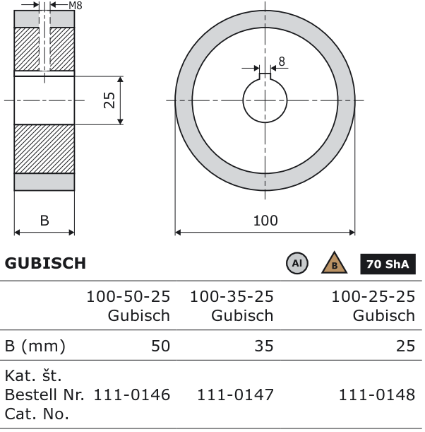 Roues d'entrainement corroyeuses GUBISCH en Ø100 mm largeur 25 - 35 - 50 mm alésage 25 mm et en dureté 70 Shore