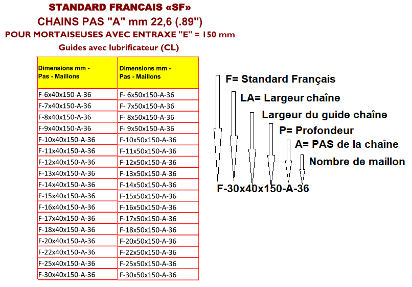 Les garnitures indiquées sont calculés pour chaînes Standard à monter sur des mortaiseuses ayant l’entraxe «E» guide-pignon de 150 mm.
