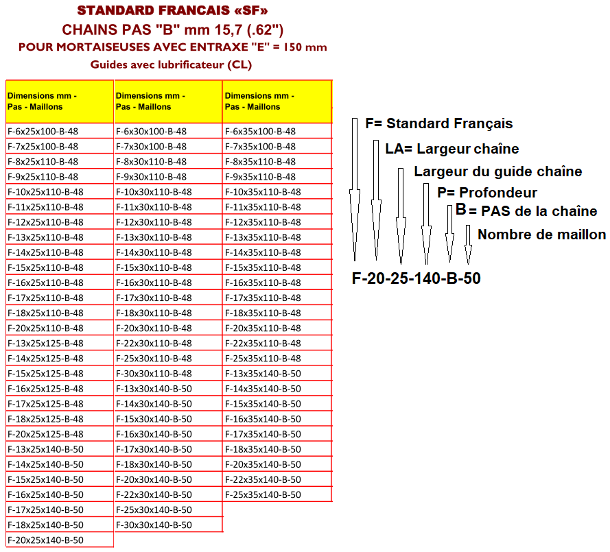 Les garnitures indiquées sont calculés pour chaînes Standard à monter sur des mortaiseuses ayant l’entraxe «E» guide-pignon de 150 mm.