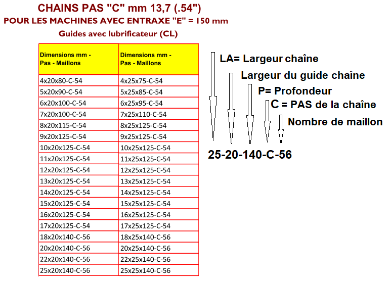 Les garnitures indiquées sont calculés pour chaînes Standard à monter sur des mortaiseuses ayant l’entraxe «E» guide-pignon de 150 mm.