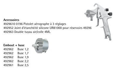 Appareil fourni avec 4 ML de tuyau double air/colle et d’un pistolet avec embout et buse 1,7.